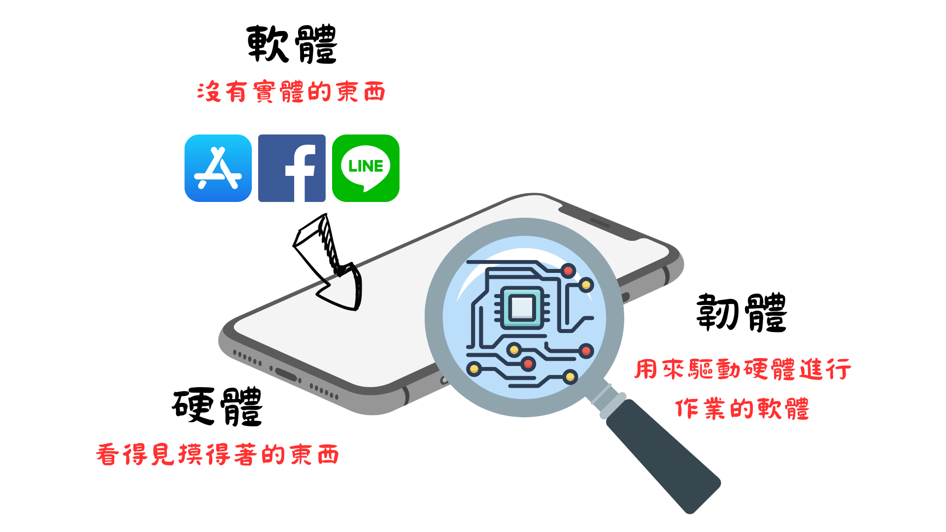 👉 軟體(Software) 用程式語言所打造出來的產品,像是APP、網頁、ERP系統,是建立在載具(電腦、手機、平板及螢幕)上的獨立執行的一支應用程式 👉 硬體(Hardware) 你能看到的電子產品及裡頭的零組件,像是主機板、晶片等 👉 韌體(firmware) 介於軟體與硬體之間,主要是透過程式語言來操控硬體,像是控制主機板、晶片的驅動程式,或是電腦的BIOS