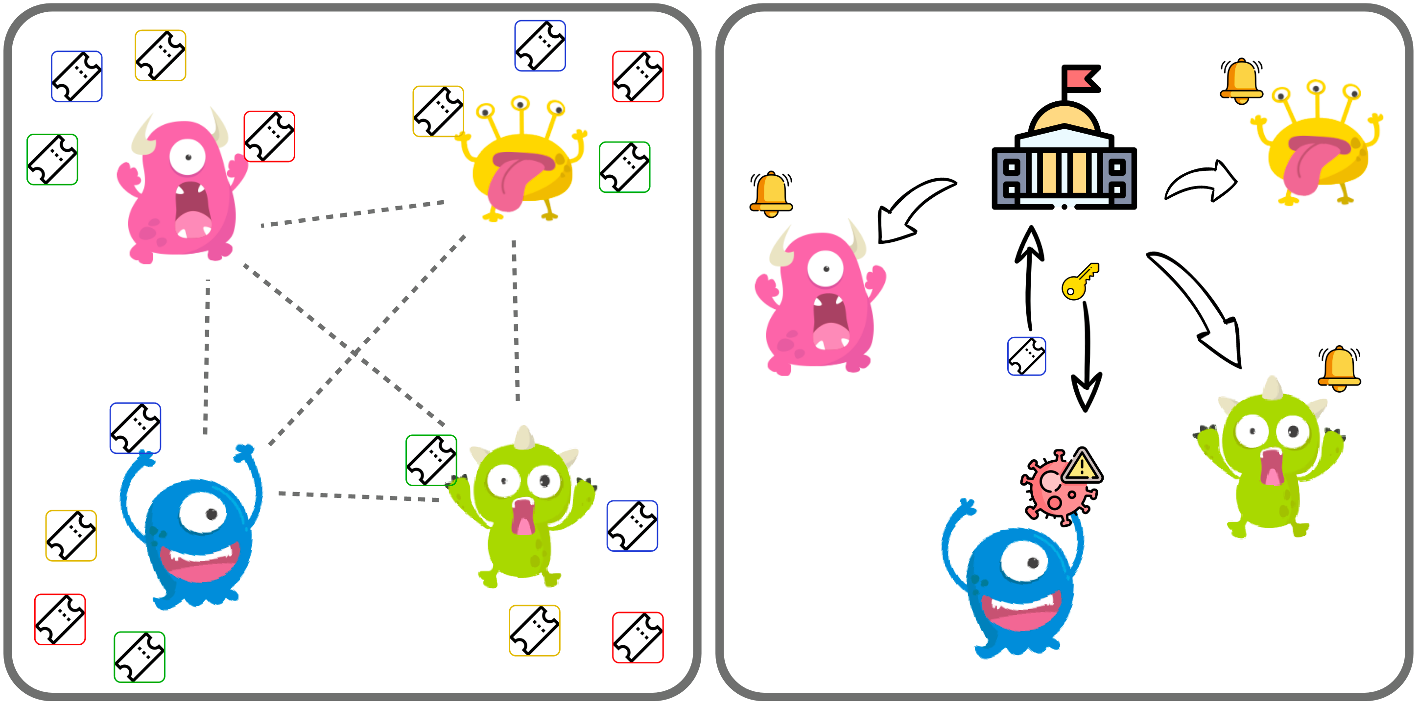 大家下載『台灣社交距離 App』了嗎 🧐 但是大家是不是擔心資料安全性的問題呢?? 今天小編來跟大家解釋一下他的運作原理吧 😎 為什麼會有這個 App 的出現呢 ⁉️ 很簡單 我們都不會想把我們的資料公開出去 但是為了快速的知道確診者😷接觸過誰 Google 和 Apple 共同提出了一個技術協議 👉 接觸通知 API (Exposure Notification API) 讓大家可以在『匿名』情況下彼此分享過去的行蹤 這樣是不是感覺安全多了啊~~ 這個通知系統背後靠的就是『藍芽』與『隨機ID』的技術 用一個小小的故事來跟大家講講吧 👩🏫 今天四隻小怪獸一起出去玩而且都帶著手機 在一般的狀況下手機會自動發送『隨機識別碼 🏷』 (p.s. 後面『隨機識別碼』都會用 🏷 代表喔 ) 也會自動接收並儲存別人的 🏷 所以怪獸們的手機都有收到別人的 🏷 很不幸小藍他確診了 😥😭 政府就會提供他一組『驗證碼 🔑』 請小藍上傳手上搜集到的 🏷 大家的手機就會『定期下載』所有確診者的 🏷 來去比對自己有沒有接觸過這個人 比對過後小黃😱發現他和小藍接觸過 手機就會跳出通知他『主動』和衛生單位聯繫📞 這就是『台灣社交距離 App』背後運作原理 捧友們有比較清楚了嗎 XDDDD