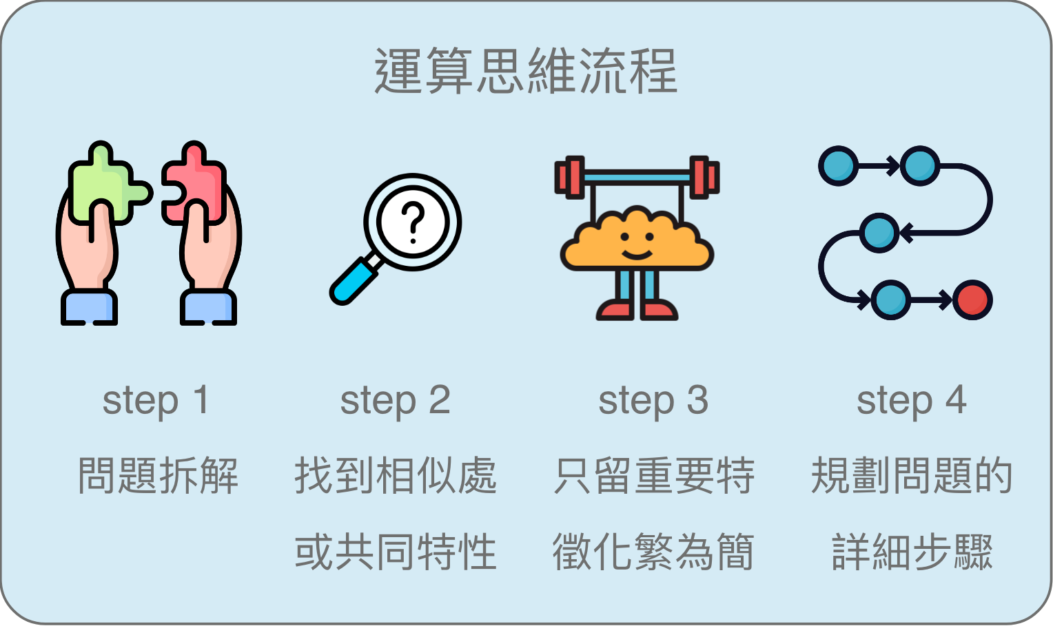 運算思維是甚麼 ? 🧐 簡單來說,就是『解決問題的方法』 面對複雜的問題,能夠理解問題的本質,發展可能的解決方案 ⁉️ 那運算思維是寫程式嗎 ? 🙃 👉 運算思維並不是寫程式,也不是像電腦一樣思考 📢 程式語言和運算思維無關,只是實現解決問題的工具 下面簡單介紹一下運算思維的流程 ❶ 拆解 👉 將問題拆解成更小更好理解的問題 ❷ 模式判別 👉 觀察數據找到它們的相似處或共同特性 ❸ 抽象化 👉 找出辨別問題的原則性 ❹ 演算法 👉 設計簡單的規則來解決問題