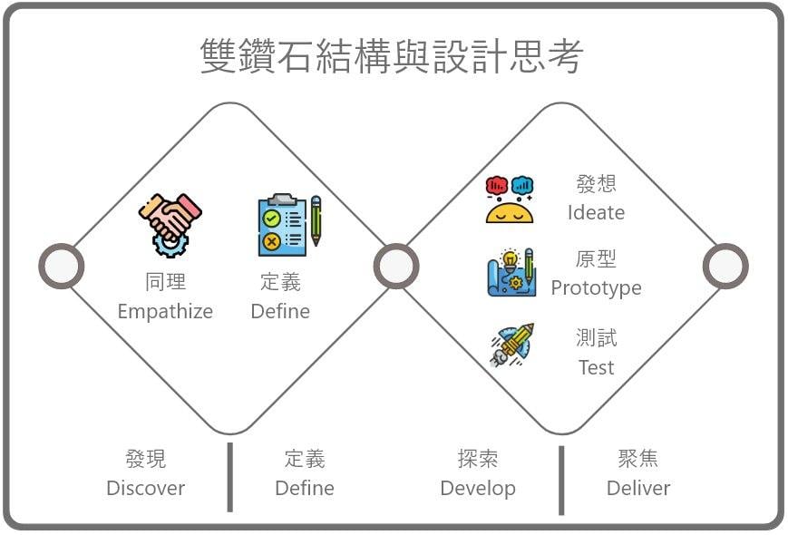 雙鑽石設計流程是由英國設計協會在2005年提出一套設計流程 主要由發現 ➡️ 定義 ➡️ 發展 ➡️ 聚焦 四階段組成 而每兩個階段就是一次的「發散 ➡️ 收斂」 也因為看起來就像是兩顆鑽石 所以大家都說雙鑽石結構囉!!😃😃 雙鑽石結構特別強調設計過程中的兩次發散與收斂 也是設計思考中比較少被強調且容易被忽略的部分 但我們可以透過雙鑽石模式來補強 💪 避免落入「定義錯問題」的黑洞 ⚫️
