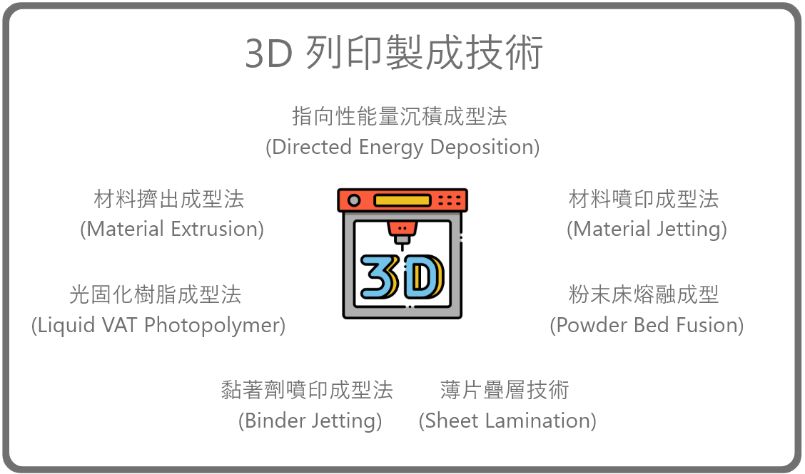 3D 列印是一種數位實體製作技術 將資訊數位化成功轉換到實體數位化生活 再利用 3D 列印機印製出來 人類科技進入了數位實體化生活 ASTM(American Society for Testing and Materials, 美國材料與試驗協會) 將 3D 列印歸納為以下 7 大種類: 👉 材料擠出成型法(Material Extrusion,ME) 👉 光固化數脂成型法(Liquid VAT Photopolymer,VP) 👉 材料噴印成型法(Material Jetting,MJ) 👉 指向性能量沉積成型法(Directed Energy Deposition,DED) 👉 黏著劑噴印成型法(Binder Jetting,BJ) 👉 薄片疊層技術(Sheet Lamination,SL) 👉 粉末床熔融成型(Powder Bed Fusion,PBF)