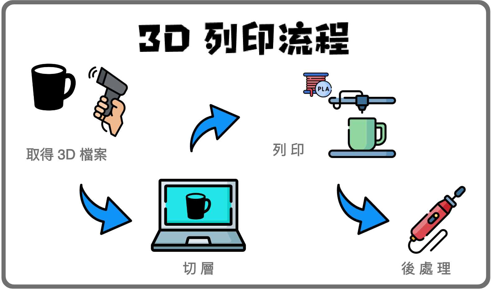 1️⃣ 取得3D檔案 👉 3D掃描 👉 自己畫圖(tinkerCAD、Onshape等) 👉 上網下載⏬(thingivers) 2️⃣ 切層 👉 設計出來的檔案無法直接列印,必須將完成的檔案轉成Gcode 檔傳至列印機,這個過程就是『切片』 👉 Cura、Kisslicer、Slic3r、Simply3D 3️⃣ 3D列印 👉 進退料 👉 列印設定 4️⃣ 後處理 👉 噴漆 👉 拋光